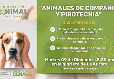 La actividad se realizará este martes 9 de diciembre a las 5:30 p.m. en la glorieta de La Aurora, frente a la bomba de Seapal. El Gobierno del Bien hace un llamado a las familias vallartenses a participar y prepararse mejor para proteger a sus animales de compañía durante estas celebraciones.