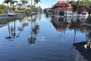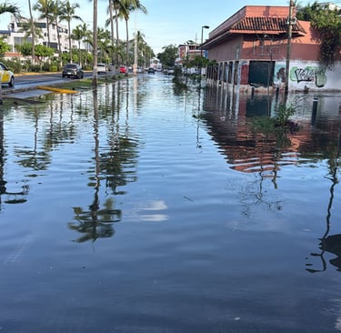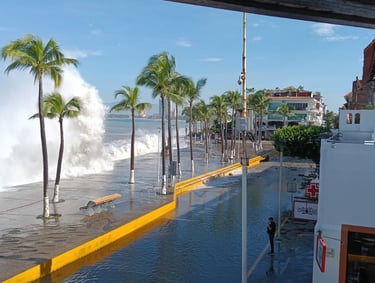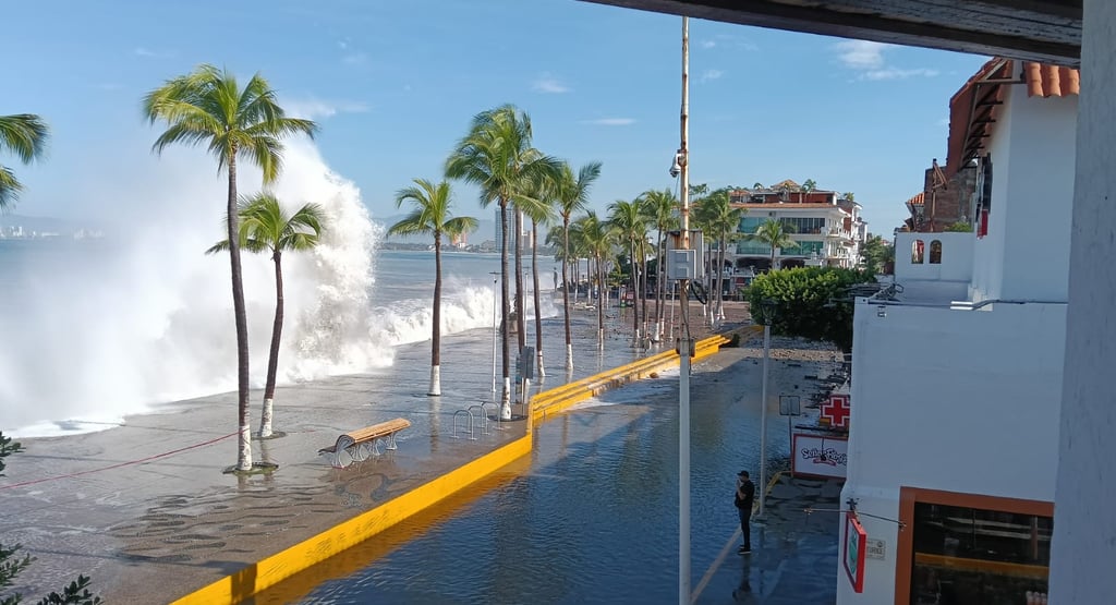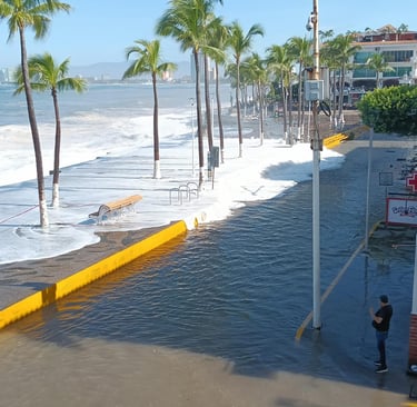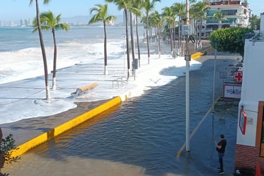 En Las Glorias, el agua del mar ingresó por las salidas pluviales y se desbordó sobre la avenida Francisco Medina Ascencio, lo que provocó inundaciones y el cierre de la lateral en sentido de sur a norte. Elementos de Tránsito Municipal permanecen en el lugar apoyando a los conductores y redirigiendo la circulación mientras se atienden las afectaciones.