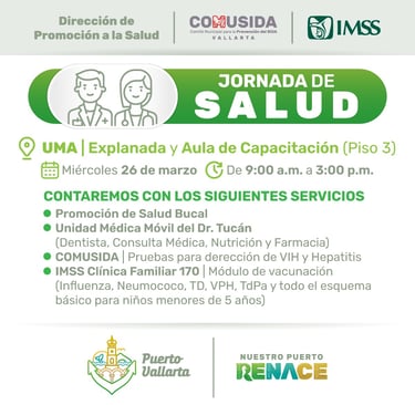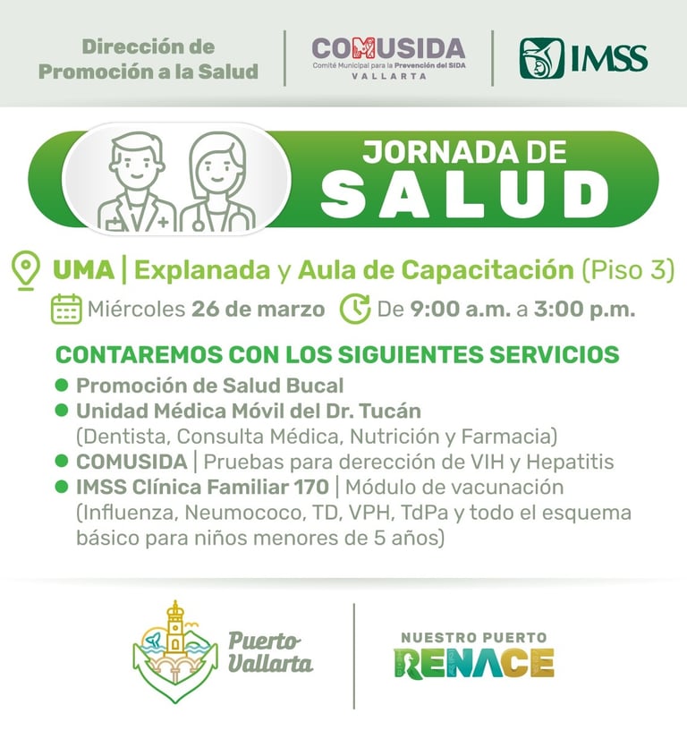 En un esfuerzo por garantizar el bienestar y la salud de todas y todos en Puerto Vallarta, el gobierno de Luis Munguía González, a través de la Dirección de Promoción a la Salud, llevará a cabo una Jornada de Salud este miércoles 26 de marzo, en la explanada y aula de capacitación (piso 3) de la UMA, en un horario de 9:00 a.m. a 3:00 p.m., con el objetivo de brindar atención médica integral, preventiva y gratuita a la ciudadanía en general.