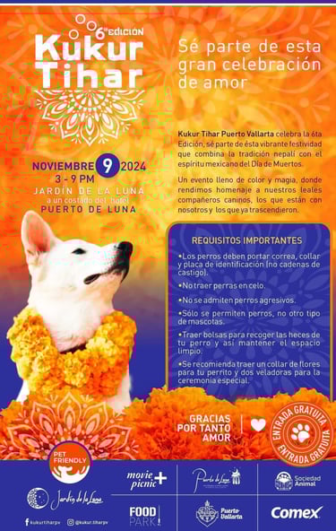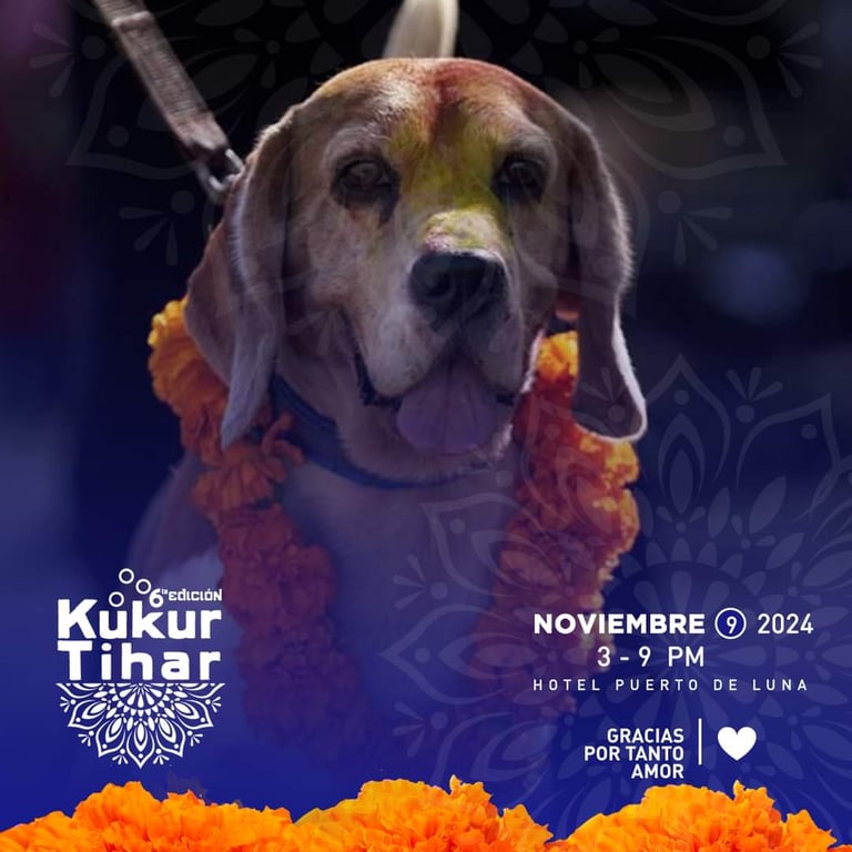 Este año, la sexta edición de Kukur Tihar en Puerto Vallarta se llevará a cabo el sábado 9 de noviembre, de 3 p.m. a 9 p.m., en el encantador Jardín de la Luna, junto al hotel Puerto de Luna.