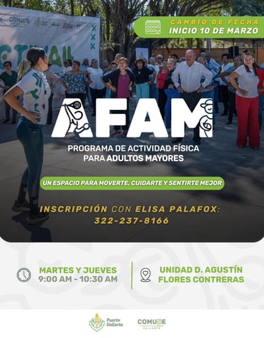 El programa AFAM (Actividad Física para Adultos Mayores) anunció su nueva fecha de inicio en Puerto Vallarta, una iniciativa impulsada por el gobierno del alcalde Luis Ernesto Munguía González, a través del Consejo Municipal del Deporte (COMUDE) que encabeza William Arredondo, con el objetivo de promover la salud, el bienestar y la convivencia entre las personas adultas mayores de la ciudad.