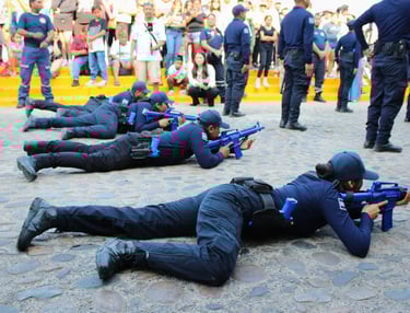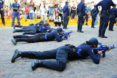 En la parte operativa del desfile, el Grupo Táctico simuló el aseguramiento de un vehículo sospechoso, mientras que el Heroico Cuerpo de Bomberos y Protección Civil escenificaron un accidente automovilístico con dos personas heridas y el control de un incendio. La Cruz Roja Mexicana complementó estas acciones con una demostración de primeros auxilios que mantuvo la atención del público.