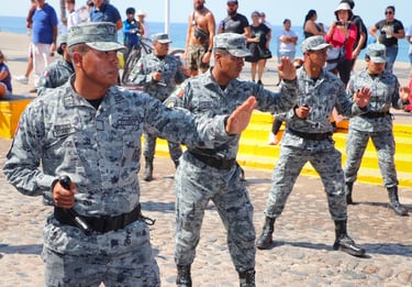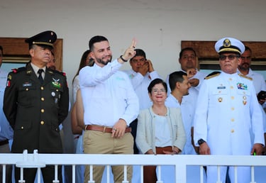 El recorrido continuó con la energía del COMUDE, cuyos contingentes realizaron demostraciones de box, voleibol de salón, karate y gimnasia artística. También participó la Comisaría de Seguridad Pública, con la Policía Turística portando la bandera nacional y la Policía Operativa, que fue ovacionada al formar una pirámide humana durante su avance.