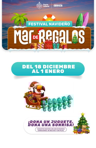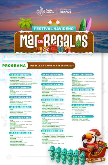 El Gobierno de Luis Munguía se complace en invitar a todos los vallartenses y visitantes al Festival Navideño "Mar de Regalos", que se llevará a cabo del 18 de diciembre al 1 de enero. Este evento es una oportunidad para que las familias se reúnan y disfruten de un ambiente festivo y lleno de regalos.