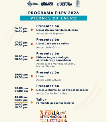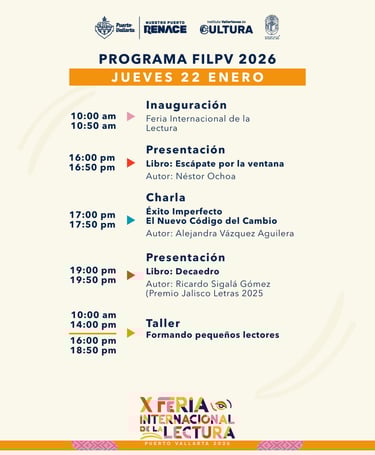 El gobierno de nuestro presidente municipal, el Arq. Luis Ernesto Munguía González, a través del Instituto Vallartense de Cultura y en colaboración con la Fundación Cultural Mecenas del Libro A.C. ,invita a la ciudadanía a sumergirse en la experiencia de la décima edición de la Feria Internacional de la Lectura Puerto Vallarta 2026, que se vivirá del 22 de enero al 2 de febrero en la Plaza de Armas, dando inicio con su inauguración este jueves a las 10:00 de la mañana.
