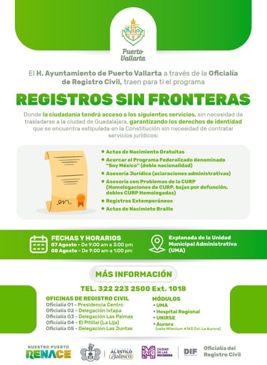 Los ciudadanos de Puerto Vallarta podrán acceder a una variedad de servicios de registro civil sin tener que viajar a Guadalajara, gracias al programa "Registro sin Fronteras" que impulsa el gobierno estatal y que es respaldado por la administración del alcalde Luis Munguía a través de la Oficialía del Registro Civil de esta ciudad.