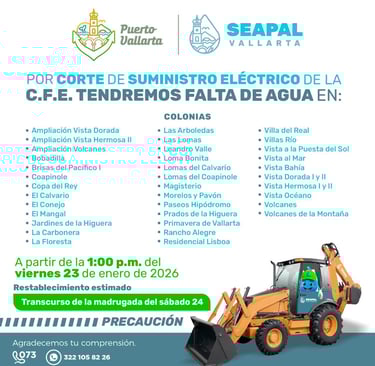 Ante este escenario, SEAPAL Vallarta realizó acciones operativas para mantener niveles óptimos en los tanques de almacenamiento y, una vez concluidos los trabajos, aplicará el protocolo correspondiente para la normalización gradual del servicio, estimada durante la madrugada del sábado 24 de enero, a fin de restablecer de manera estable la presión y continuidad del suministro en la zona.
